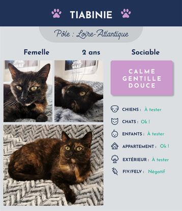 Bonjour ! Je m’appelle Tiabinie, je suis une petite écaille de tortue de 2 ans. Je suis particulièrement gentille et douce. J’accorde une grande confiance aux humains qui ne me font pas peur du tout, il est très facile de me caresser, d’autant plus que j’adore ça ! Je suis très calme et j’adore dormir (on ne me verra pas souvent jouer ou avoir un quart d’heure de folie !), mais je suis aussi très à l’aise quand il y a plusieurs humains autour de moi, cela me rend curieuse ! Je suis sociable avec les autres chats, l’agressivité, ce n’est pas du tout mon genre ! J’ai énormément d’amour et d’affection à donner.
