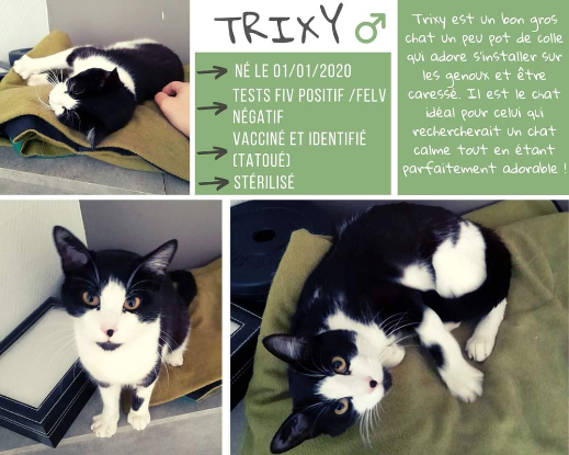 Trixy est un chat adorable qui aime beaucoup les caresses et les câlins, il ne manquera pas d'en réclamer.