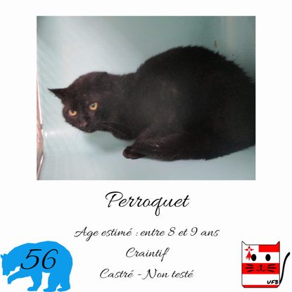 Perroquet est un mâle de 8-9 ans craintif (un comportement normal en fourrière) qui vous attend dans une fourrière du 56. ATTENTION SORTIE AU PLUS TARD LE 13/05/2022 (avant euthanasie) !