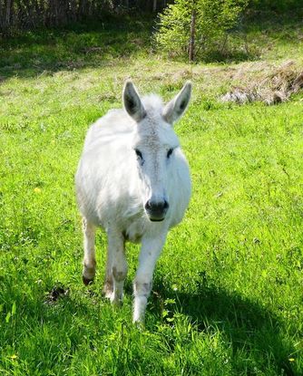 Sahel est une gentille et jolie ânesse blanche de 22 ans, toisant dans les 1,20 m