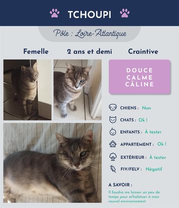 Bonjour, je m'appelle Tchoupi ! Je suis une chatte européenne grise toute douce. J'adore les caresses (surtout dans le cou) et manger ! Je suis craintive, donc il faudra me laisser un peu de temps pour m'habituer à ma nouvelle famille et à mon environnement. Une fois ce pas franchi, je n'hésiterais pas à vous montrer toute mon affection ! Je suis borgne de l'œil gauche mais cela ne me dérange absolument pas. Je reste tout de même une bonne chasseuse de mouche et je reste très joueuse !