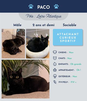 Coucou ! Je m’appelle Paco ! Moitié chat, moitié panthère, je ne peux que vous séduire avec mon beau pelage noir.
