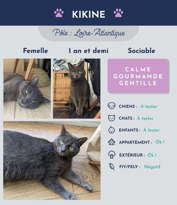 Bonjour ! Moi c’est Kikine, une belle femelle de bientôt 2 ans aux reflets gris/bleus. De nature calme et sociable, j’aime bien suivre les humains d’une pièce à l’autre une fois que j’ai confiance en eux. Je peux être câlinée, portée et même venir me blottir dans votre cou pour roupiller mais mes envies sont aléatoires ; Je peux tout aussi bien préférer rester dans mon coin pour vous observer ou faire une sieste. Malgré le nombre de balles en peluche après lesquelles je courre chaque jour, je suis un peu en surpoids… Ma gloutonnerie est donc à surveiller !