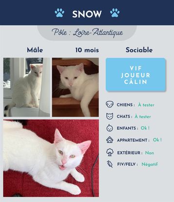 Bonjour ! Je suis Snow, un petit mâle blanc de 10 mois. Je raffole des câlins mais aussi des jeux : je ne m’en lasse pas et j’aime sauter partout ! La nuit, je m’occupe tout seul sans déranger mes humains, car je sais qu’ils auront besoin d’énergie pour jouer et me câliner toute la journée ! J’ai besoin d’attention. J’en demande beaucoup, mais je suis adorable!
