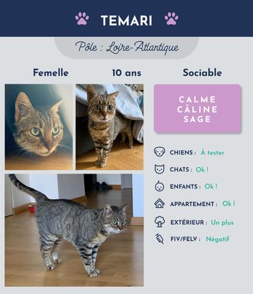 Chalut, je m'appelle Temari, je suis une chatte d’environ 10 ans. Le vétérinaire et ma famille d'accueil ne connaissent pas réellement mon âge. J'étais déjà stérilisée quand j'ai été trouvée mais sans identification donc mes anciens humains ont dû m'abandonner (et je ne comprends pas pourquoi parce je suis adorable).