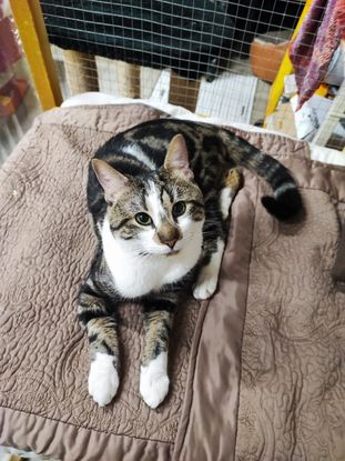 Description : Tchoupi est un loulou très sociable, qui a besoin de présence et d’interaction. Il papote beaucoup avec nous et nous demande beaucoup de câlins. C’est un magnifique chat qui sera sociable avec les enfants et les autres chats. Nous ne connaissons pas ses ententes avec les chiens. Il aura besoin d’un accès extérieur pour se dépenser et surtout d’espace.