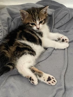 Comportement : Téo est un petit chaton joueur, plus timide que sa sœur. Il a bon appétit et se laisse rapidement amadouer par une bonne gamelle et des calins.