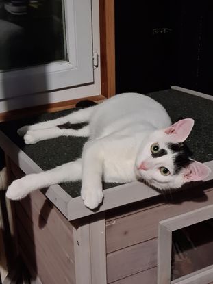 Chaton mâle, type Européen, coloris blanc avec taches noires. Né le 16 avril 2022