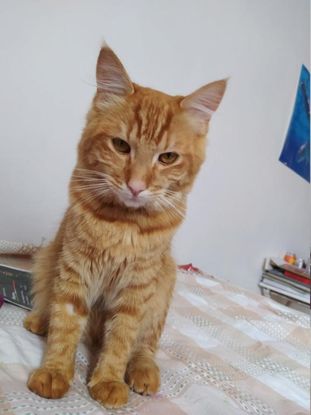 C'est un jeune chat à la magnifique robe roux foncé très douce et aux yeux doré-noisette, avec une superbe queue en panache. Il a tout de suite été à l'aise avec nous et la maison, propre et ne faisant pas de bêtises, si on excepte sa propension à vouloir tout goûter !