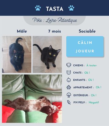 Je m'appelle Tasta, j'ai 6 mois, et je suis un petit chat noir très câlin, parfois un peu pot de colle.