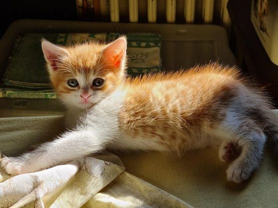 Chaton mâle, type Européen, coloris roux tigré roux foncé et blanc. Age : environ 5 semaines (à confirmer avec notre vétérinaire).