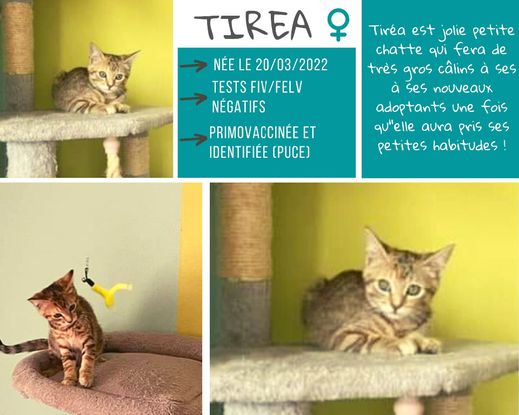 Tirea est une jolie petite chatte qui fera de très gros câlins une fois qu'elle aura pris ses petites habitudes.