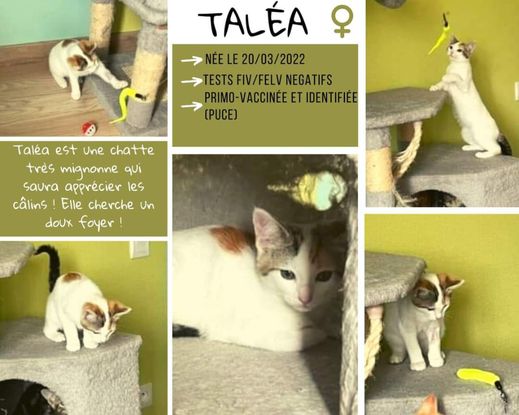 Taléa est une minette très mignonne, elle apprécie beaucoup les câlins. Elle cherche un doux foyer