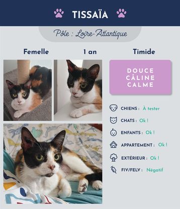 Moi c'est Tissaïa, une adorable petite femelle d'environ un an. Arrivée chez ma famille d'accueil avec mes deux chatons, je suis très douce. Il me faudra quelques jours pour m'habituer à mon nouvel environnement mais je deviens ensuite très très câline. J'ai commencé à jouer un peu, maintenant que mes petits sont plus grands, mais je préfère encore me coller à vous pour patouner, faire la sieste ou quémander des caresses. Je recherche la compagnie humaine ou des autres chats. Ma seule rencontre avec un chien je suis restée en hauteur à l’observer. Je n'ai absolument aucune agressivité et aime les caresses des enfants mais fuis quand je prends peur.