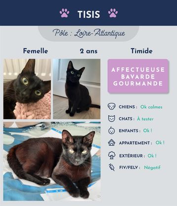 Je suis Tisis, une belle femelle toute noire d'à peine 2 ans. Je viens d'élever mes 4 bébés et je cherche maintenant moi aussi ma famille pour la vie. Je suis un peu timide mais rapidement je viendrai vers vous pour des caresses et plein de ronrons ainsi que vous faire la conversation… je suis une petite bavarde ! La vie en appartement me convient mais un extérieur me ferait plaisir. Ah oui, j'oubliais, je suis une grande gourmande ![]()