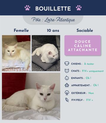 Coucou les amis, je suis Bouillette. Je suis une petite chatte de 10 ans super câline, je viens me blottir dans tes bras, je dors entre tes jambes et quand tu n’es pas là j’adore m’endormir sous les draps, plaids et oreillers.
