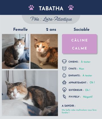 Chalut, moi c'est Tabatha, mais vous pouvez m'appeler comme vous voulez. Dès que l'on m'appelle, je viens pour des caresses. Je suis super sociable avec les humains et d'un tempérament calme. Je pourrai passer des heures sur vous ou à côté de vous à me faire câliner, et m'endormir ainsi. D'ailleurs si vous arrêtez ou que je veux des caresses, je frotte ma tête contre vous ou poser la patte sur votre bras. Je pourrai aussi faire de tout petits miaulements que ma famille d'accueil trouve "Trop chou !". Etant super proche des humains, je préfèrerais être le seul chat du foyer.