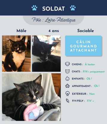 Chalut ! Moi, c’est Soldat. Je suis un mâle âgé de 4 ans. J’ai été rescapé de la rue il y a maintenant plus d’un an. J’ai appris petit à petit à avoir confiance en l’homme, et aujourd’hui je ne pense qu’à une chose : venir faire des câlins en ronronnant et dormir au soleil. Je suis aussi très gourmand. Maintenant que j’ai connu la chaleur du foyer, je ne demande pas à sortir à l’extérieur. Tant mieux d’ailleurs, car je suis FIV +. Je devrai donc rester à l’intérieur, et être le seul chat du foyer. Cependant, je suis très sociable et je pense que je m’entendrai très bien avec des enfants. Si vous m’adoptez, je vous donnerai une montagne d’amour et de ronrons. Au plaisir de vous rencontrer !
