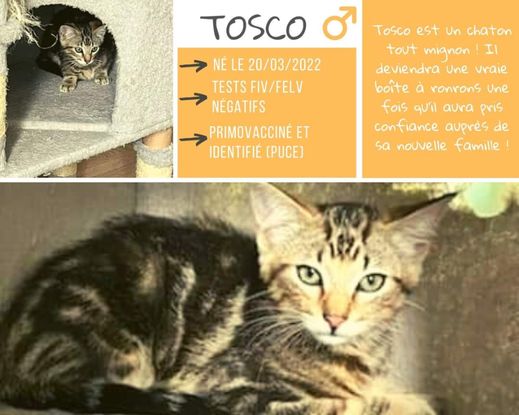 Tosco est un chaton mignon. Il deviendra une vraie boîte à ronrons une fois qu'il aura pris confiance en sa nouvelle famille.