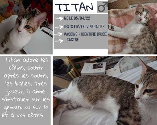 Titan est identifié (puce), primovaccinée et testé fiv/felv négatif.