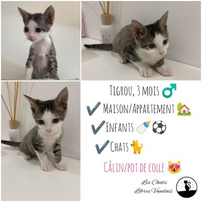 Tigrou est un petit chaton qui a vécu un début de vie difficile. Laissée dehors dans un carton, une fratrie de 3 chatons. Récupérés un peu à la volée par des habitants, ils ont rapidement été rejetés dehors ... car oui, un chaton de quelques jours ça se biberonne, avec du lait maternisé (et pas lait de vache, ou pain de mie...). Mais aussi, un chaton de quelques jours il faut lui masser le ventre pour l'aider à faire caca et pipi... Tigrou est le seul à avoir survécu ... arraché à ses 2 autres frères et soeurs qui n'ont pas eu la même chance que lui.