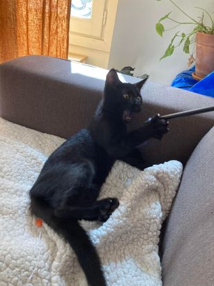 Bach est un chaton très joueur. Il adore les petites souris a grelot. Il a deux tâches blanches au niveau du torse et de l'abdomen. Il est très timide et n'ose pas encore le contact avec l'humain. Il est curieux et s'approche de plus en plus, et les caresses sont parfois les bienvenues au moment de la sieste, mais il faudra probablement beaucoup de patience pour qu'il vienne de lui-même. Il est également très sage et propre.