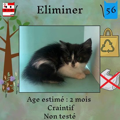 Eliminer est un mâle de 2 mois craintif (un comportement normal en fourrière) qui vous attend dans une fourrière du 56. ATTENTION SORTIE AU PLUS TARD LE 08/07/2022 (avant euthanasie) !