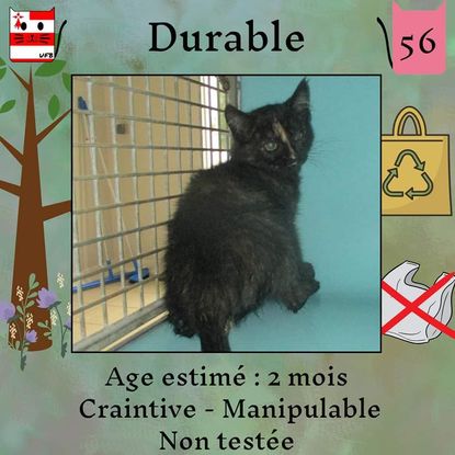 Durable est une femelle de 2 mois craintive (un comportement normal en fourrière) qui vous attend dans une fourrière du 56. ATTENTION SORTIE AU PLUS TARD LE 08/07/2022 (avant euthanasie) !