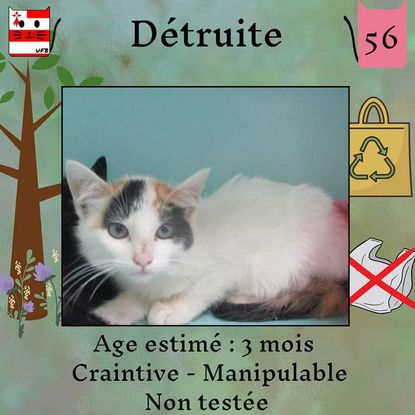 Détruite est une femelle de 3 mois craintive (un comportement normal en fourrière) qui vous attend dans une fourrière du 56. ATTENTION SORTIE AU PLUS TARD LE 08/07/2022 (avant euthanasie) !