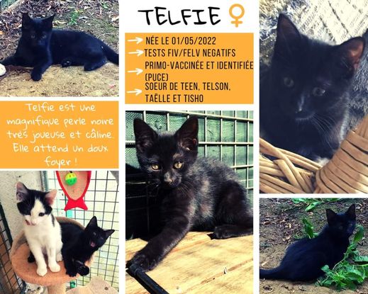 Telfie est une magnifique perle noire, très joueuse et câline. Elle attend un doux foyer.