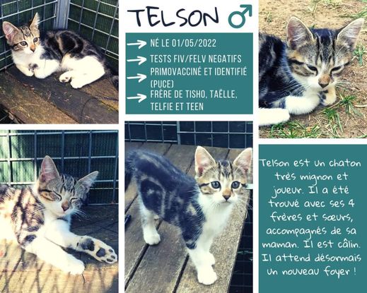 Telson est un chaton très mignon et joueur. Il a été trouvé avec ses 4 frères et sœurs accompagné de sa maman. Il est câlin. Il attend désormais un nouveau foyer.