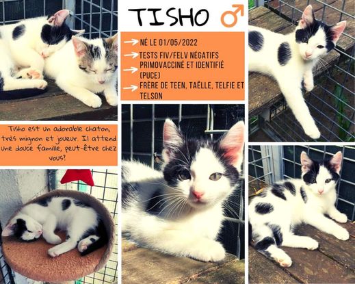 Tisho est identifié (puce), testé fiv/felv négatifs et primovacciné