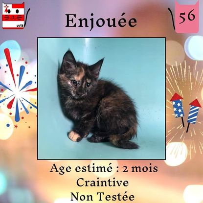 Enjouée est une femelle de 2 mois craintive (un comportement normal en fourrière) qui vous attend dans une fourrière du 56. ATTENTION SORTIE AU PLUS TARD LE 15/07/2022 (avant euthanasie) !