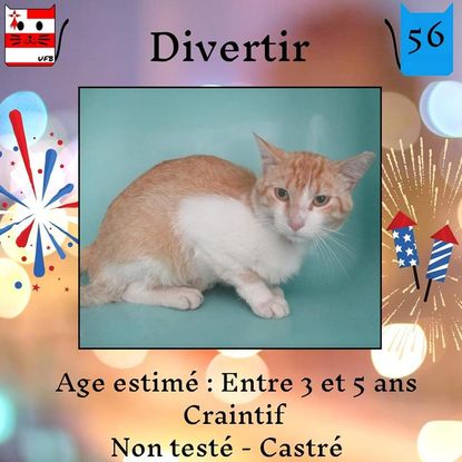 Divertir est un mâle de 3-5 ans craintif (un comportement normal en fourrière) qui vous attend dans une fourrière du 56. ATTENTION SORTIE AU PLUS TARD LE 15/07/2022 (avant euthanasie) !