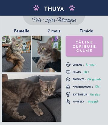 Je m'appelle Thuya, j'ai 7 mois et je suis une femelle ayant un petit gabarit, des yeux un poil globuleux qui me donnent un charme fou. Je suis timide au premier abord mais je me révèle très vite affectueuse à m'en jeter dans vos mains pour recevoir l'ultime caresse qui me fait tomber au sol, j'adore patouner sur toute sortes de surfaces (les jambes, le canapé, et aussi sur vous) ceci dit, je patoune en sortant mes griffes tellement je m'étire les coussinets alors prudence avec les enfants, ça peut être désagréable, mais je ne fais pas de blessures). Je suis une chatte plutôt calme, j'ai vécu quelques semaines dans un logement avec un extérieur sécurisé et un autre chat et j'appréciais beaucoup faire des va-et-viens avec l'intérieur.