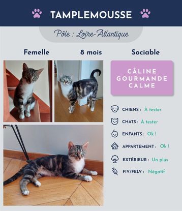 Je suis Tamplemousse, la jolie Frimousse. Je suis une jeune chatte aux beaux yeux verts très expressifs et j'ai le poil très doux. Je suis timide au début mais après quelques jours au calme, je me transforme en fan de câlins. Je me roule et fais voir mon ventre pour avoir plein de câlins et je demande beaucoup d'amour. Je suis très gourmande, j'aime surtout la pâtée.