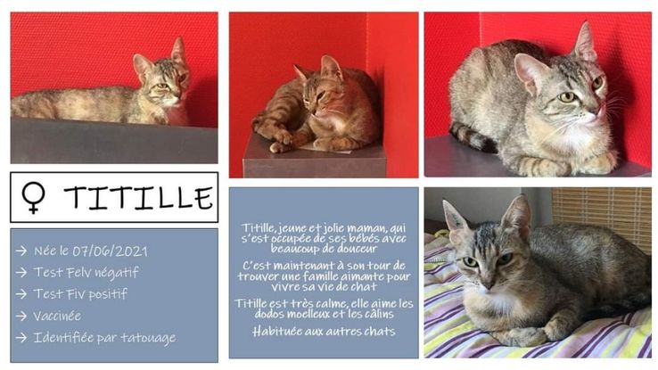 Jeune et jolie maman qui s'est occupée de ses bébés avec beaucoup de douceur. C'est maintenant à son tour de trouver une famille aimante pour vivre sa vie de chat. Titille est très calme, elle aime les dodos moelleux et les câlins. Habituée aux autres chats