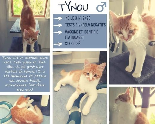 Tynou est identifié (tatouage), vacciné, stérilisé et testé FIV/FELV négatifs.