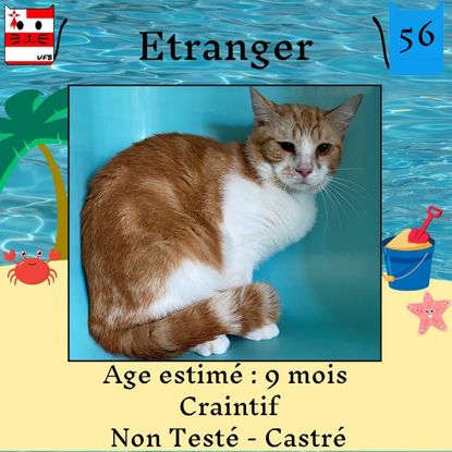 Etranger est un mâle de 9 mois craintif (un comportement normal en fourrière) qui vous attend dans une fourrière du 56. ATTENTION SORTIE AU PLUS TARD LE 22/07/2022 (avant euthanasie) !
