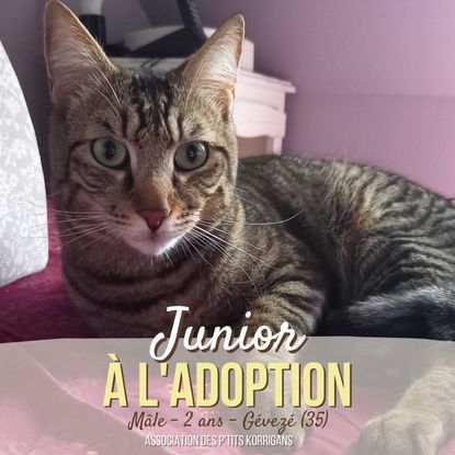 Junior a été pris en charge avec sa sœur Salomé alors qu’ils venaient d’atterrir avec leur maman dans un jardin. Une fois rentrés au chaud, il leur a fallu un peu de temps pour se détendre. Junior a été plus vite sociabilisé que sa sœur, aujourd'hui il est très à l'aise, câlin, joueur et curieux.
