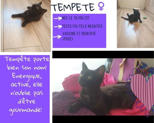 Tempête est identifiée (puce), vaccinée et Testée fiv/felv négatifs.