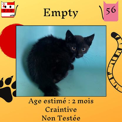 Empty est une femelle de 2 mois craintive (un comportement normal en fourrière) qui vous attend dans une fourrière du 56. ATTENTION SORTIE AU PLUS TARD LE 29/07/2022 (avant euthanasie) !