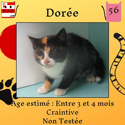 Dorée est une femelle de 3-4 mois craintive (un comportement normal en fourrière) qui vous attend dans une fourrière du 56. ATTENTION SORTIE AU PLUS TARD LE 29/07/2022 (avant euthanasie) !