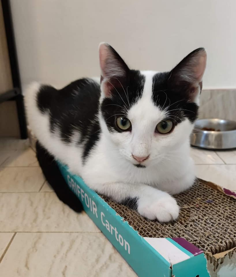 Salut moi c'est Fish, je suis un jeune mâle de trois mois. Je suis noir et blanc et d'une grande gentillesse. Je suis joueur comme ma sœur mais un peu plus calme. J'adore jouer avec ma sœur, attraper des plumeaux en l'air, faire tourner des bouchons de pommes potes. Je suis malin et j'apprends vite. Je suis un peu plus craintif que ma soeur mais quand je suis en confiance j'adore les gratouilles et je ronronne fort. Lorsque ma soeur vient au contact des humains pour interagir, parfois je l'imite et parfois je reste légèrement en retrait pour observer calmement.