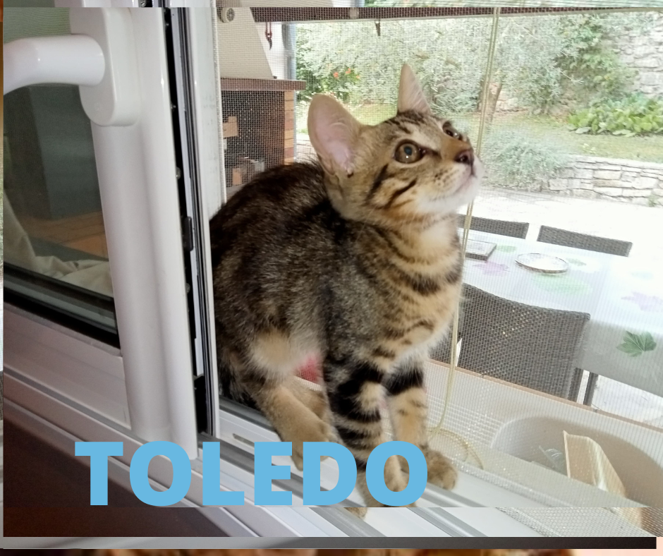 TOLEDO est un petit chaton TROGNON. il ronronne quand on le caresse. TOLEDO aime etre caresser partout sur le dos, le ventre et ensuite repartir jouer .