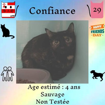 Confiance est une femelle de 4 ans sauvageonne (un comportement normal en fourrière) qui vous attend dans une fourrière du 29. ATTENTION SORTIE AU PLUS TARD LE 05/08/2022 (avant euthanasie) !