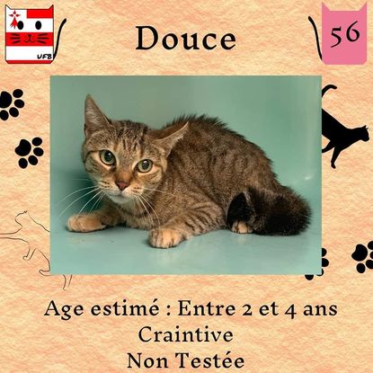 Douce est une femelle de 2-4 ans craintive (un comportement normal en fourrière) qui vous attend dans une fourrière du 56. ATTENTION SORTIE AU PLUS TARD LE 12/08/2022 (avant euthanasie) !