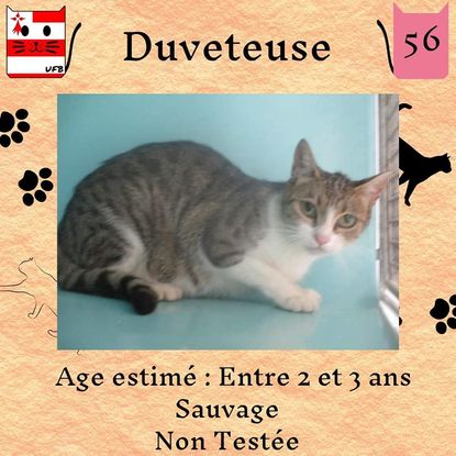 Duveteuse est une femelle de 2-3 ans sauvageonne (un comportement normal en fourrière) qui vous attend dans une fourrière du 56. ATTENTION SORTIE AU PLUS TARD LE 12/08/2022 (avant euthanasie) !