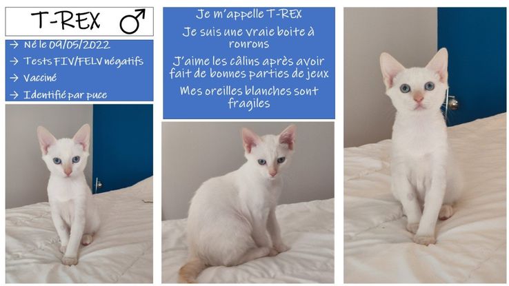 Je m'appelle T-Rex, je suis une vraie boîte à ronrons. J'aime les câlins après avoir fait de bonnes parties de jeux. Mes oreilles blanches sont fragiles.