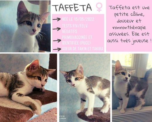 Taffeta est une petite câline, douceur et ronronthérapie assurées. Elle est aussi très joueuse!!